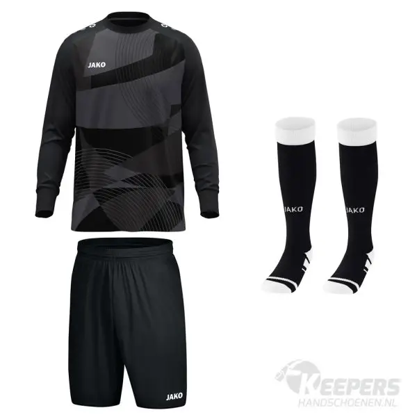 Het Jako River Keeperstenue Zwart bestaat uit het Jako Keepershirt River met een prachtig design en elleboogbescherming. Het Jako River Keeperstenue Zwart is naast Zwart ook te bestellen in de kleuren Rood, Blauw en Mint. De sets bestaat naast het shirt over een bijpassende Jako korte broek en Jako voetbalkousen.